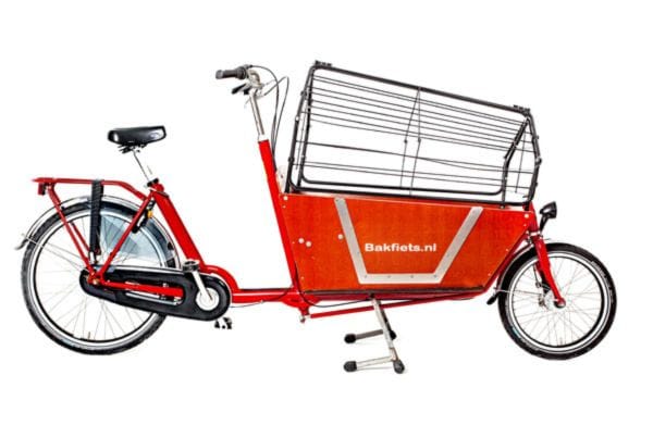 Deze bakfiets met open hondenrek (ruif) is perfect voor frisse en veilige ritten met je hond — ideaal voor energieke viervoeters die graag hun kop in de wind steken.